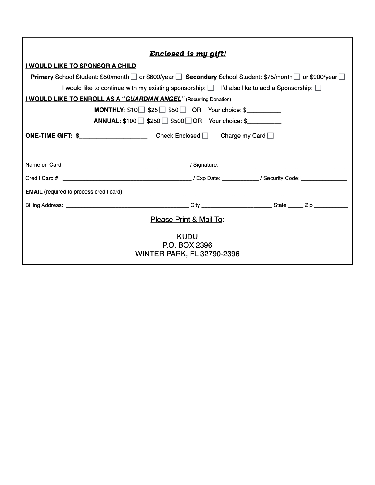 Florida Registration No. CH23446. KUDU does not employ professional fundraising solicitors.